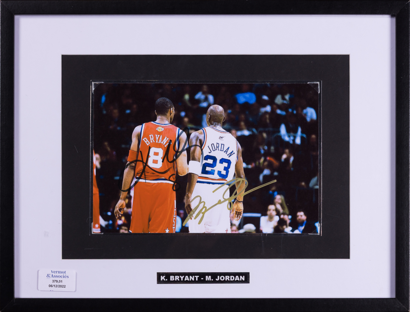 Colour photograph (15x23 cm), autographed by Kobe Bryant and Michael Jordan, relating to the 2003 All-Star Games.