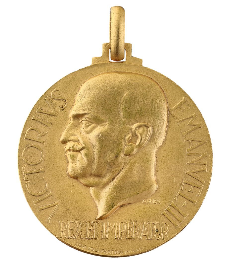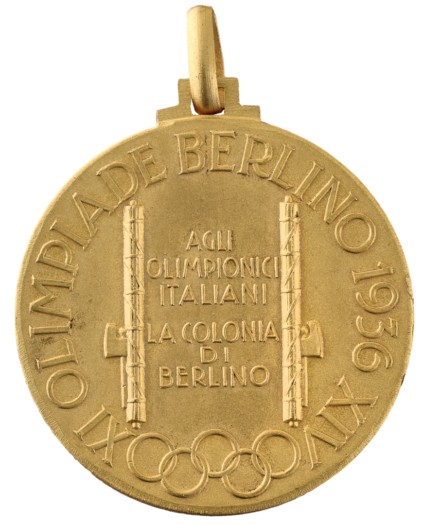 Commemorative medal, in gilded bronze, minted to celebrate the participation of Italian athletes in the 1936 Berlin Olympics. In original box.