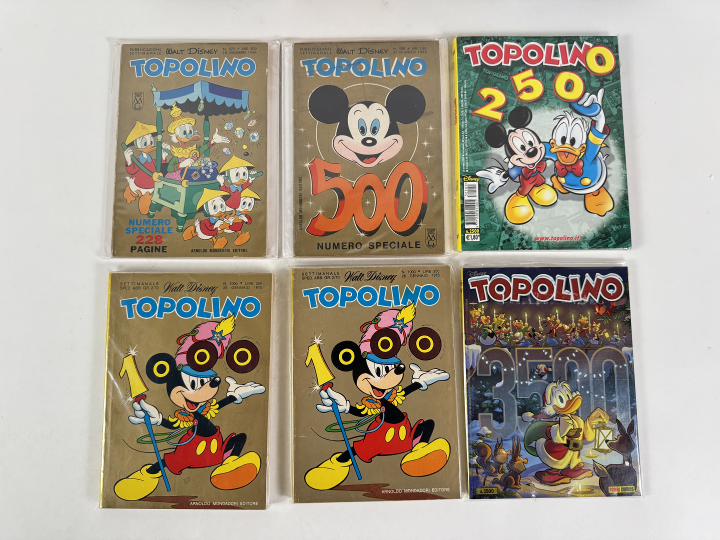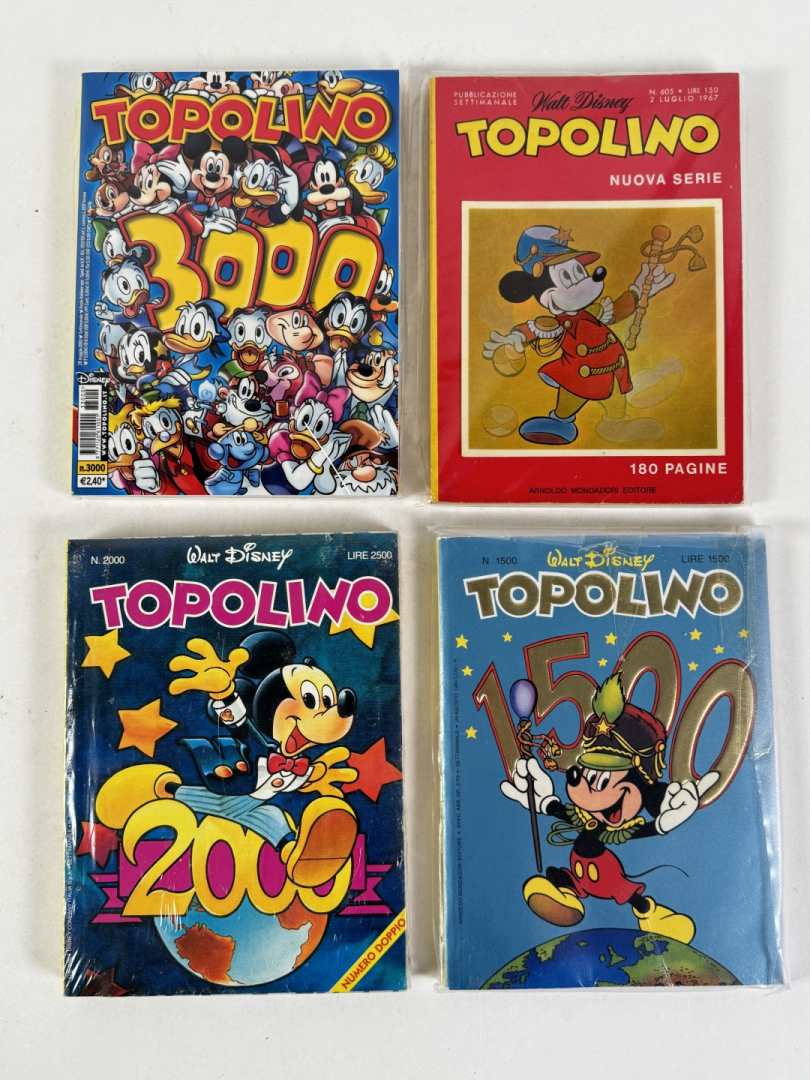 Lotto composto da dieci albi di Topolino Libretto, NN. 605 (senza gadget), 577, 500, 1000 2x, 1500, 2000 blisterato, 2500, 3000, 3500. In eccellenti condizioni.