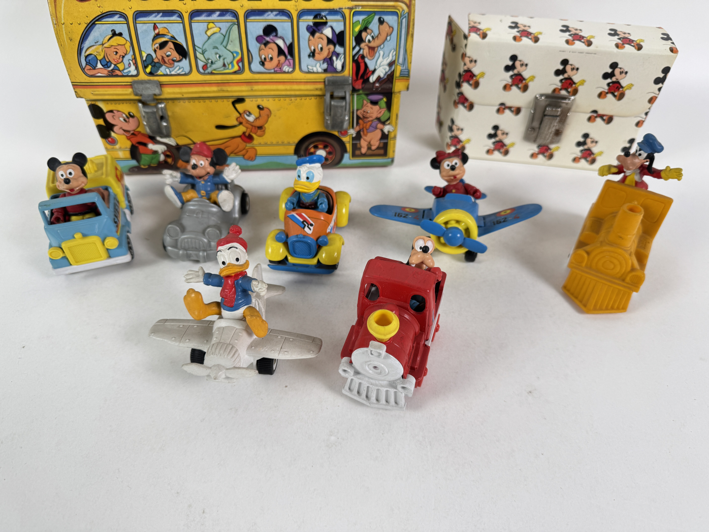 Lotto composto da: Schoolbus in latta anni '70, pochette per l'asilo in cartone, e 7 modellini in metallo scala 1:43. In buone condizioni.