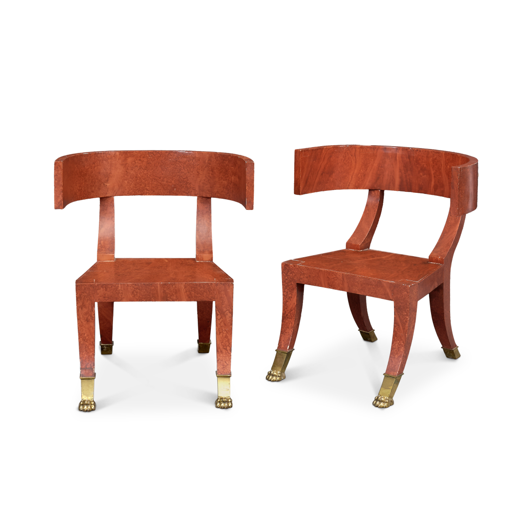 Varnished wood, reinterpretation of the Greek Klismos model with two brass feral feet adorning the two front legs of the armchair.