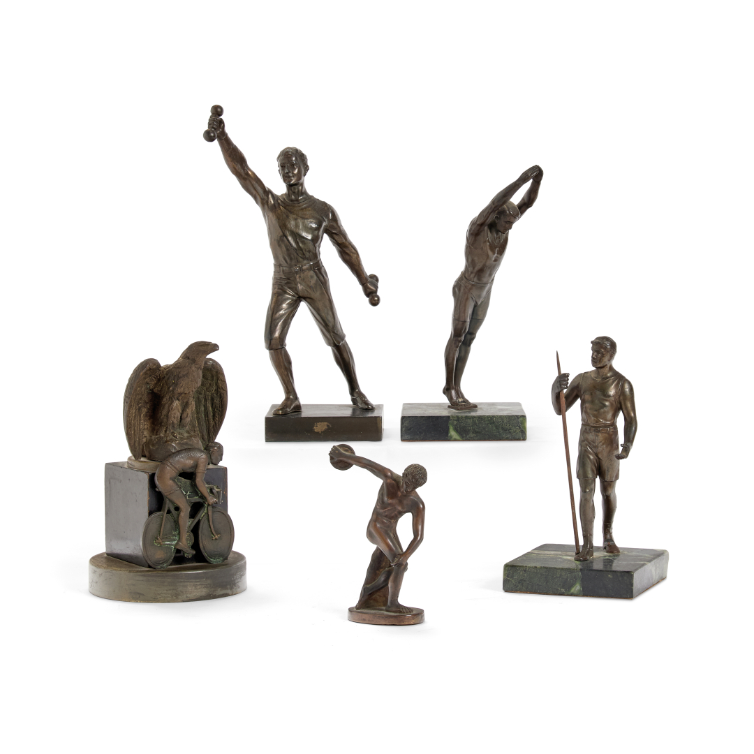 Bronze, burnished bronze and antimony, on marble and metal bases, depicting various athletes including a discus thrower, a weightlifter, a diver, a javelin thrower and a cyclist under a monument with an eagle.