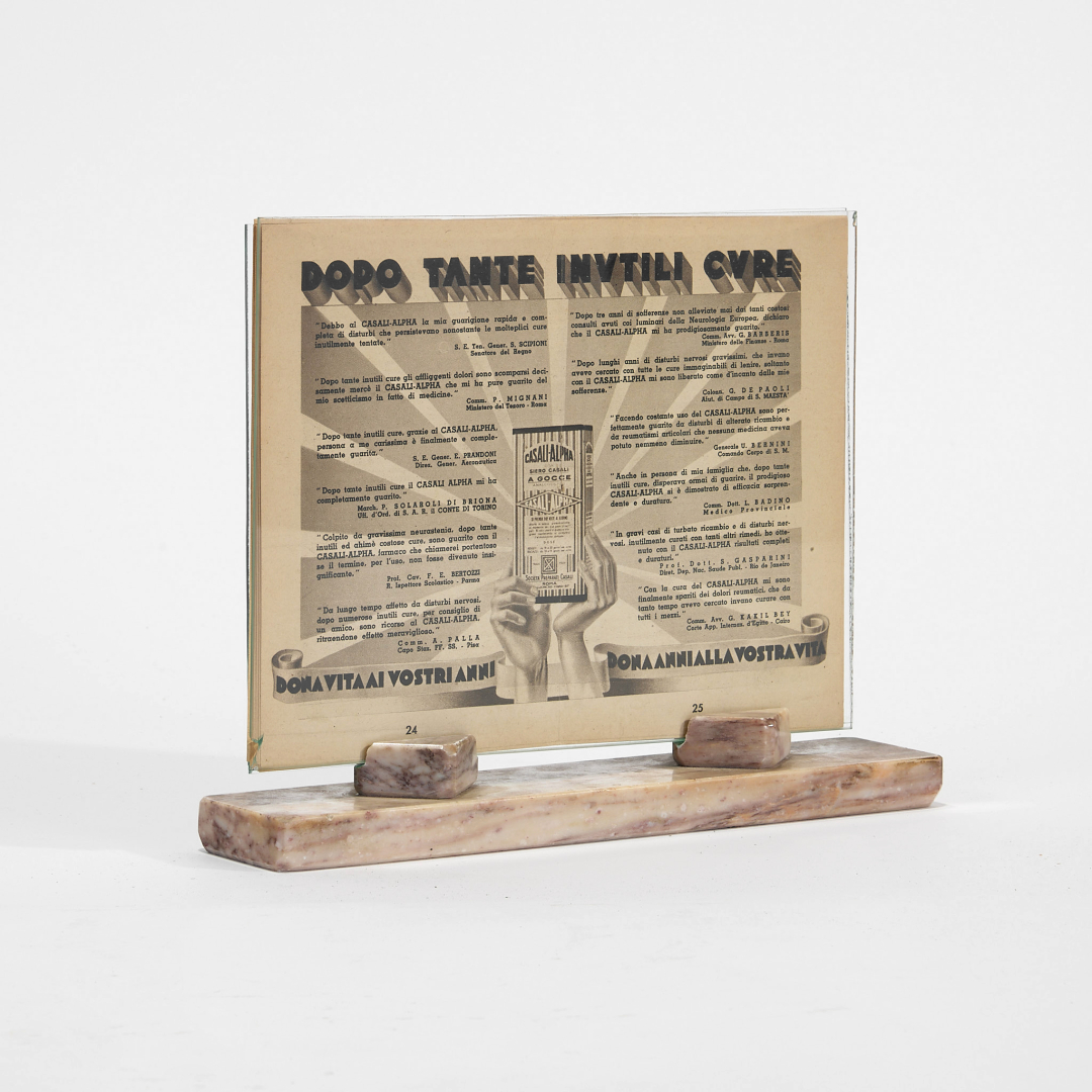 Casali-Alpha advertising booklet for Siero Casali, within glass plates, on a marble base.