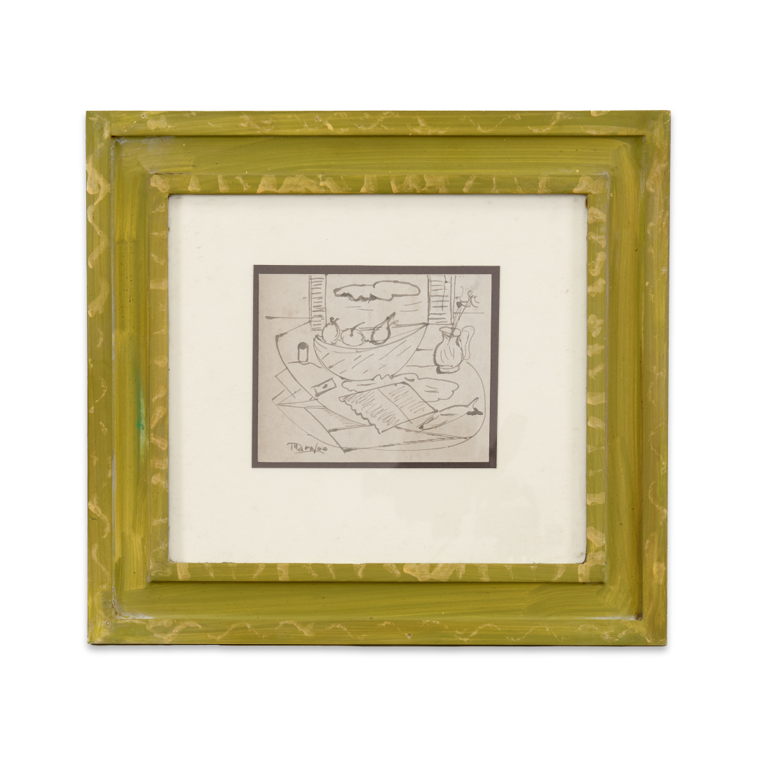 Sepia ink on paper, one depicting a still life with objects and signed on the front lower left, the other a futurist landscape, signed and bearing a dated inscription, partially legible on the front lower right.