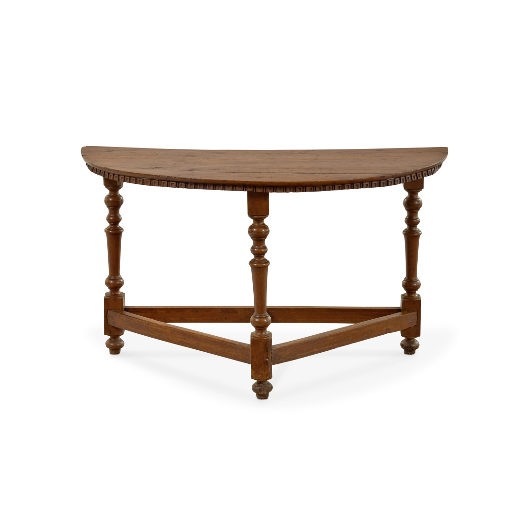 Linden and walnut top, tripod, baluster legs joined by crossbars.