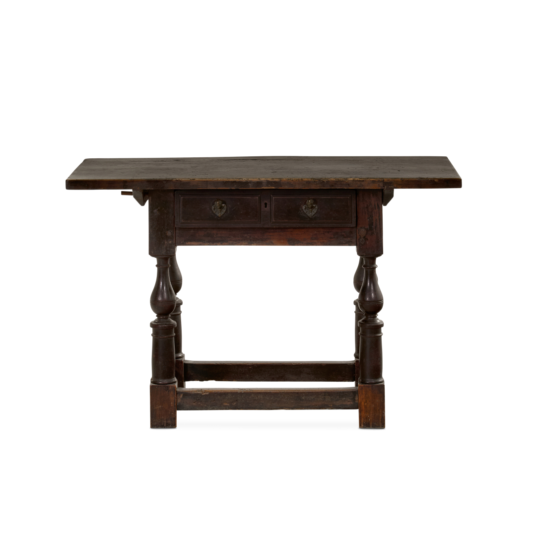 Dark walnut, baluster legs joined by crossbars, two small drawers on the front.
