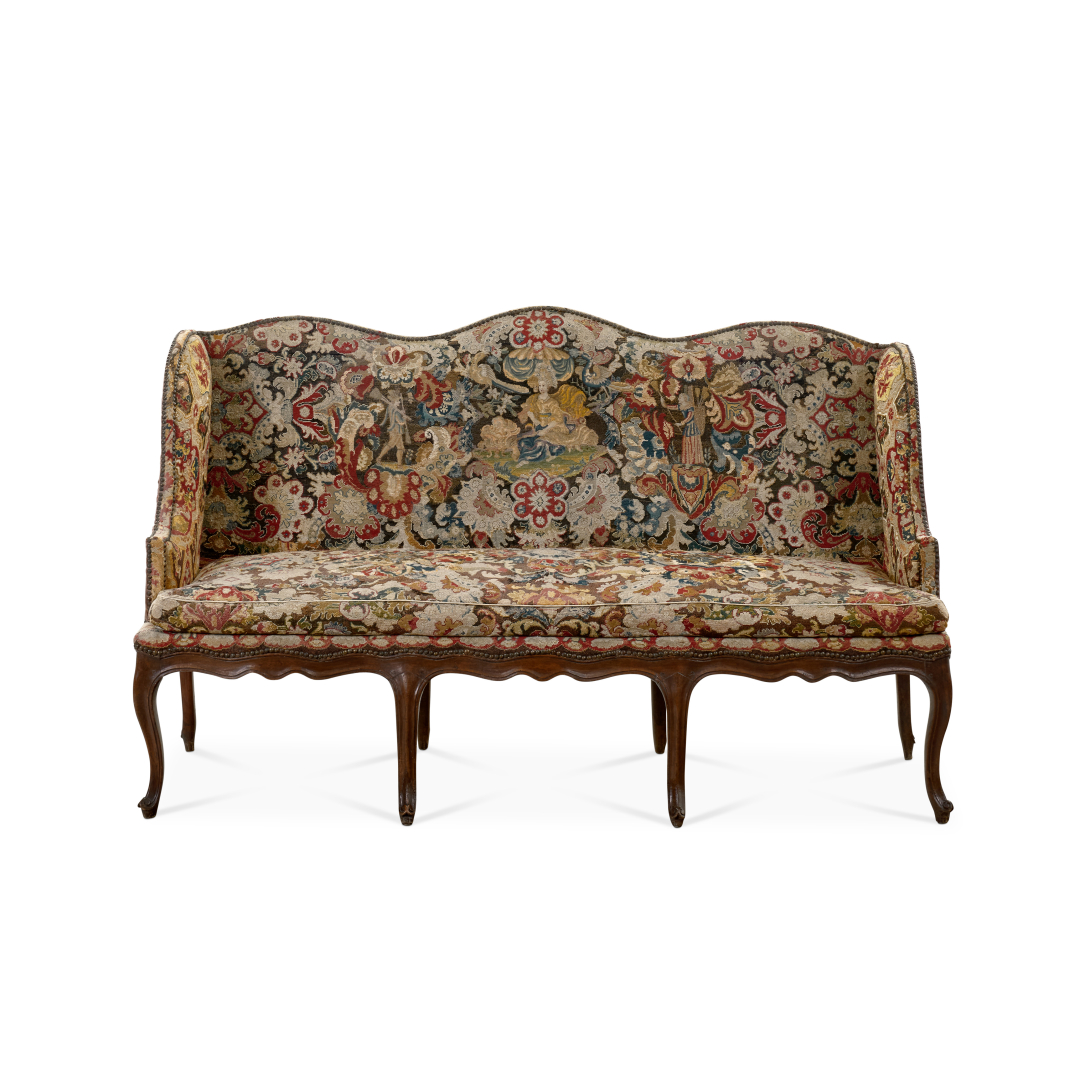 Shaped walnut, high backrest and shaped sides, petit point embroidered fabric depicting allegorical scenes and floral motifs upholstering, bearing the label “Antichità Pietro Accorsi, Torino”.