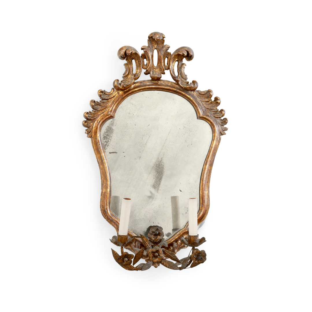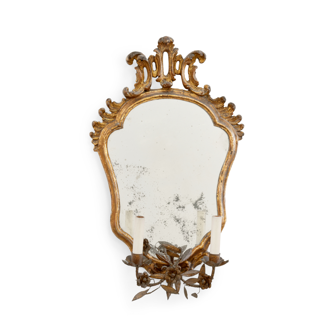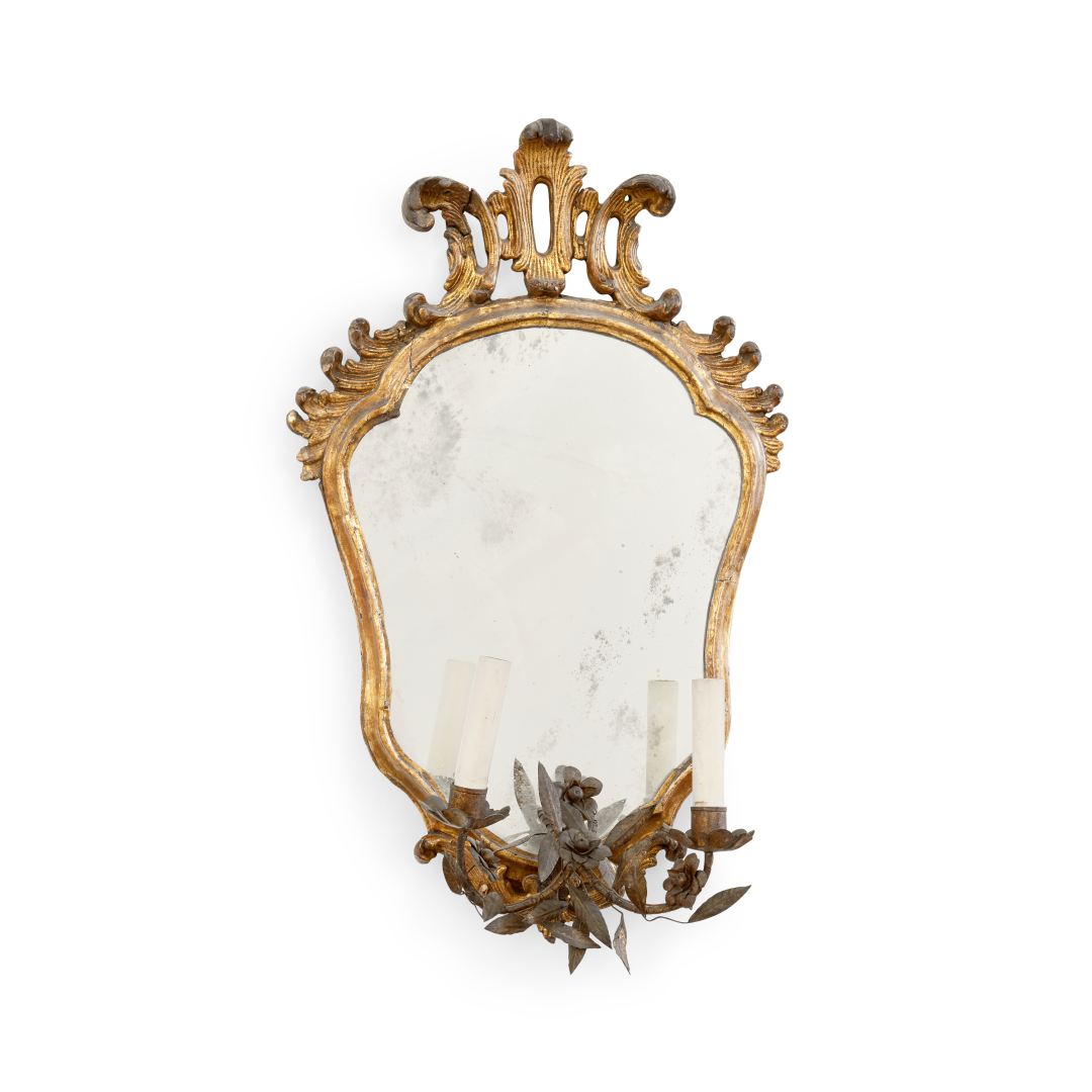 Carved gilt-wood and tin, shaped, the cymatium with rocaille decoration, with two lights, electrified.