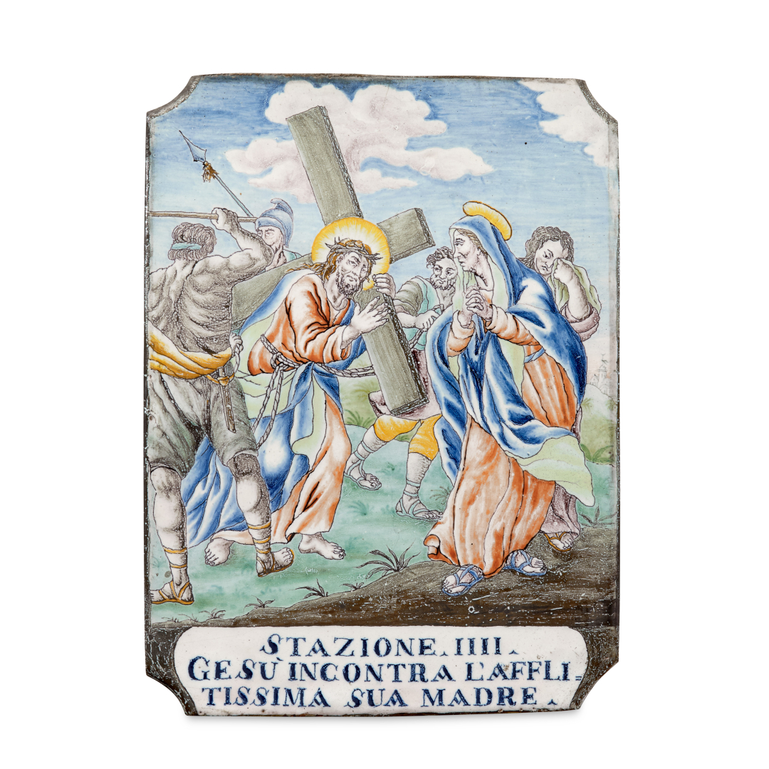 Majolica, polychrome decoration depicting Jesus' encounter with the Virgin Mary during the Way of the Cross.