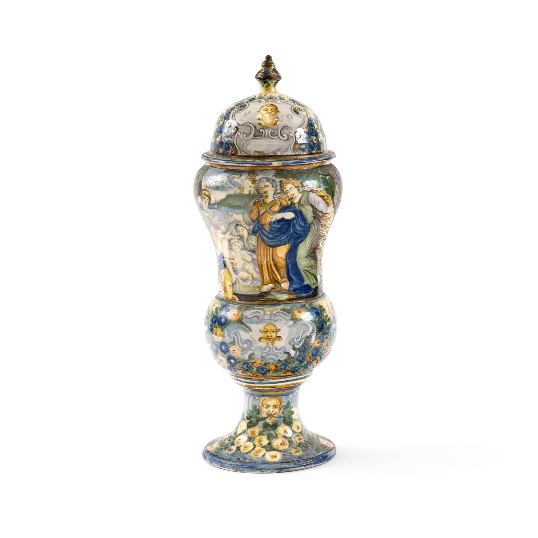Majolica, polychrome biblical scenes in the style of the Grue family decoration.