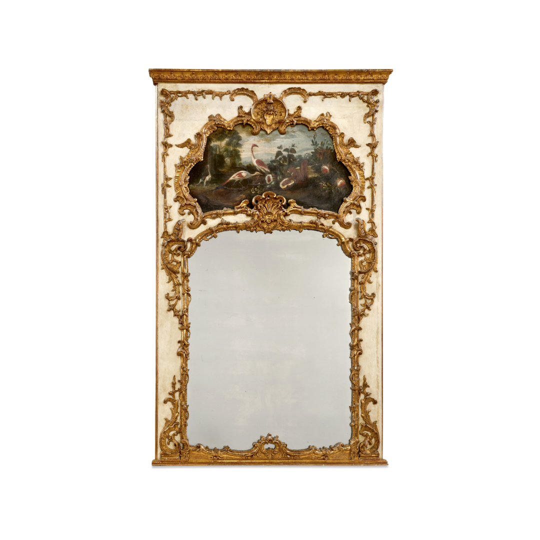 Lacquered wood with rich carved gilt-wood decoration featuring leafy scrolls and rocailles, the mirror topped with a shell. At the top, a large shaped reserve reveals an oil painting depicting a still life of birds, flowers, fruit and squirrels.