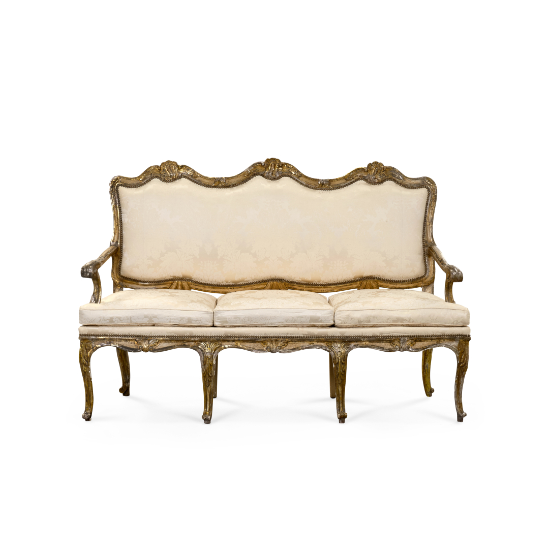Carved, lacquered and mecca silvered wood, three-seater, the backrest with decorative rocailles clasps applied, curled armrests, on curved legs and champagne-coloured damask silk upholstering.
