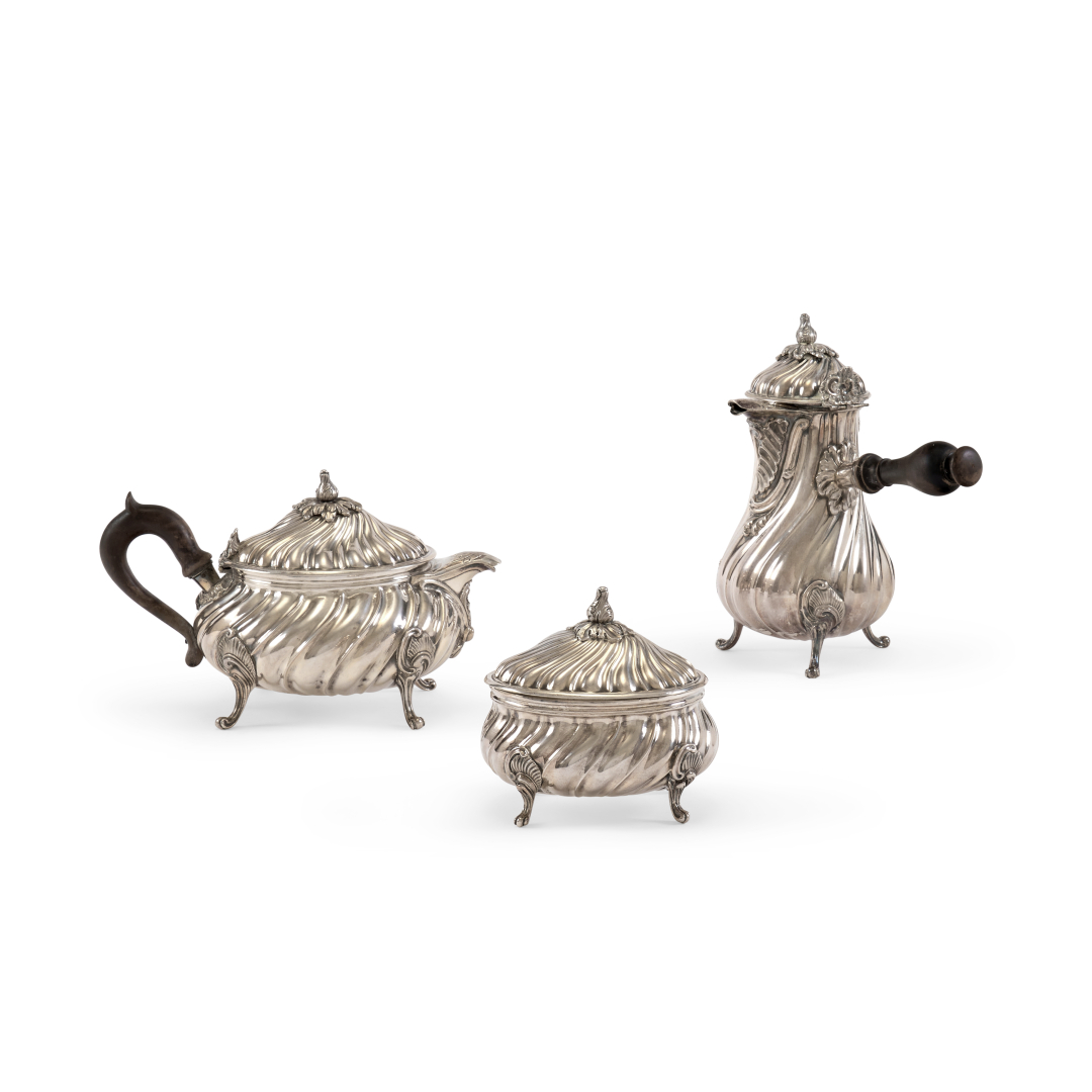 Comprising a pear-shaped coffee pot with a wooden handle, an oval teapot and sugar bowl, a teapot with a wooden handle, and twisted grooved bodies.