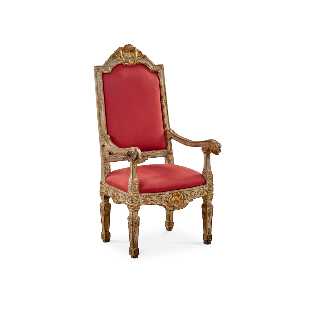 Carved, lacquered and gilt-wood, curled armrests with leaf-shaped clasps and plant motif decorations, high backrest topped with a shell, red fabric upholstering.