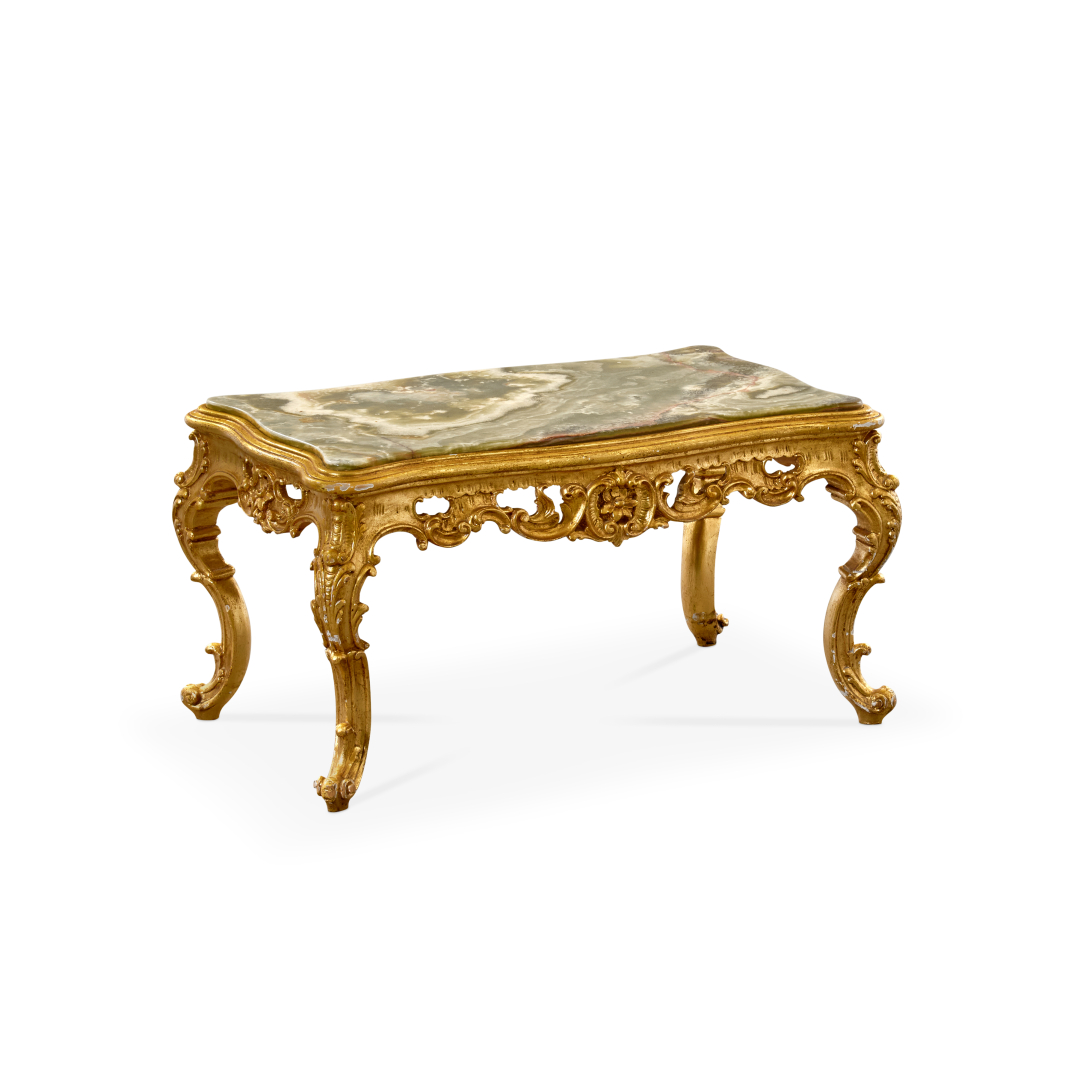 Carved and gilt-wood, shaped, with curved legs, decorated with rocailles, leaf scrolls and shells, with a green onyx top.