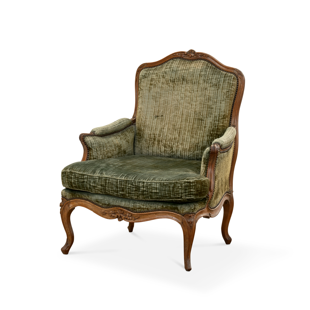Carved wood with flowers-shaped motifs, green velvet upholstering.