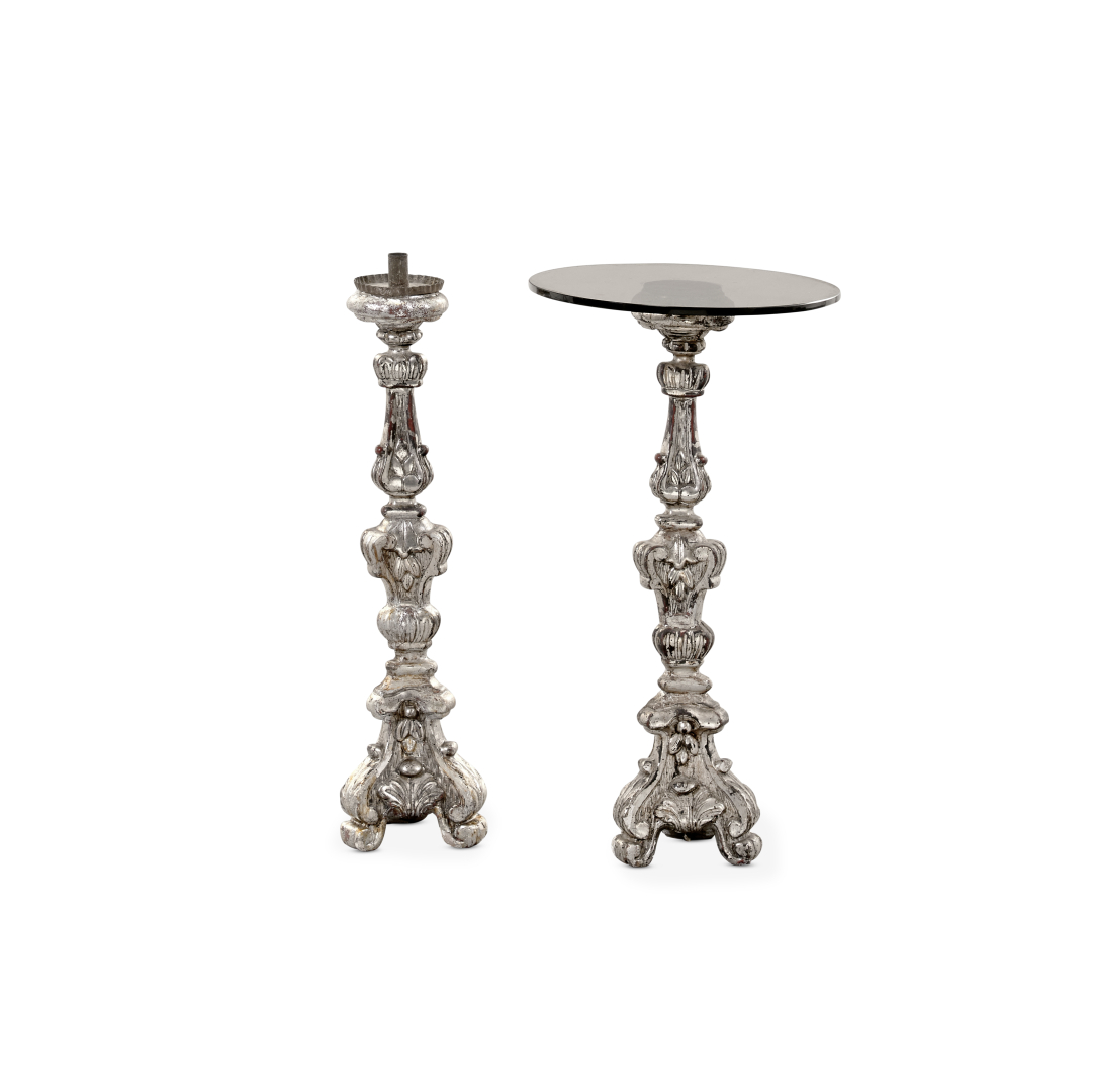 Carved and mecca silvered-wood with minimal traces of polychrome painting, baluster stem, tripod, one mounted with a round glass top.