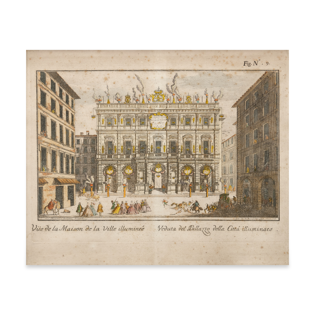 Etching with coeval colouring, printed by Giorgio Casimiro de Prenner based on a design by Massone in The sumptuous illumination for the wedding of Carlo Emanuele III to Elisabetta di Lorena.