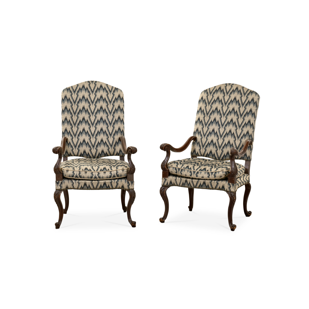 Carved wood, shaped, curved armrests ending in curls, on curved legs, modern fabric with geometric decoration upholstering.