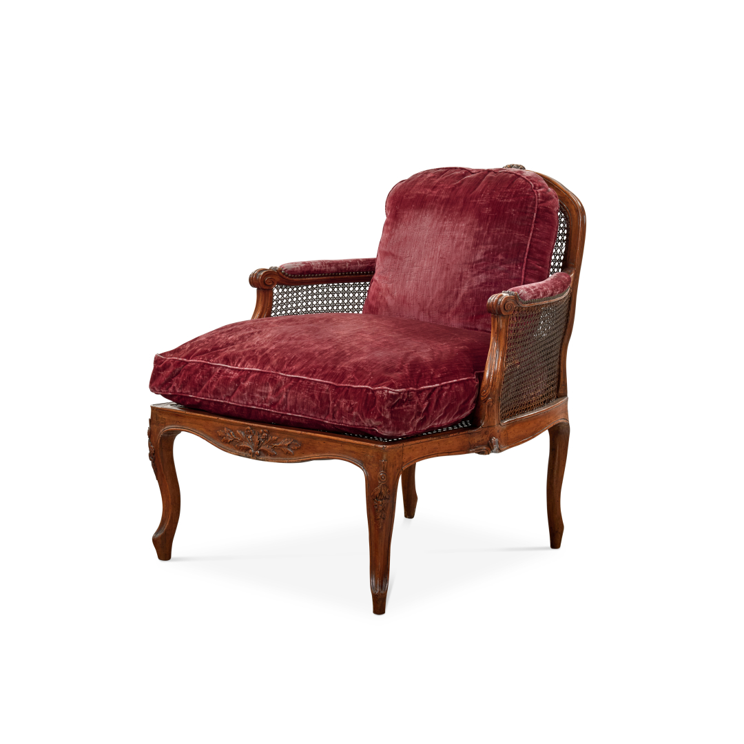 Carved wood, backrest and sides in Vienna straw, burgundy velvet upholstering.