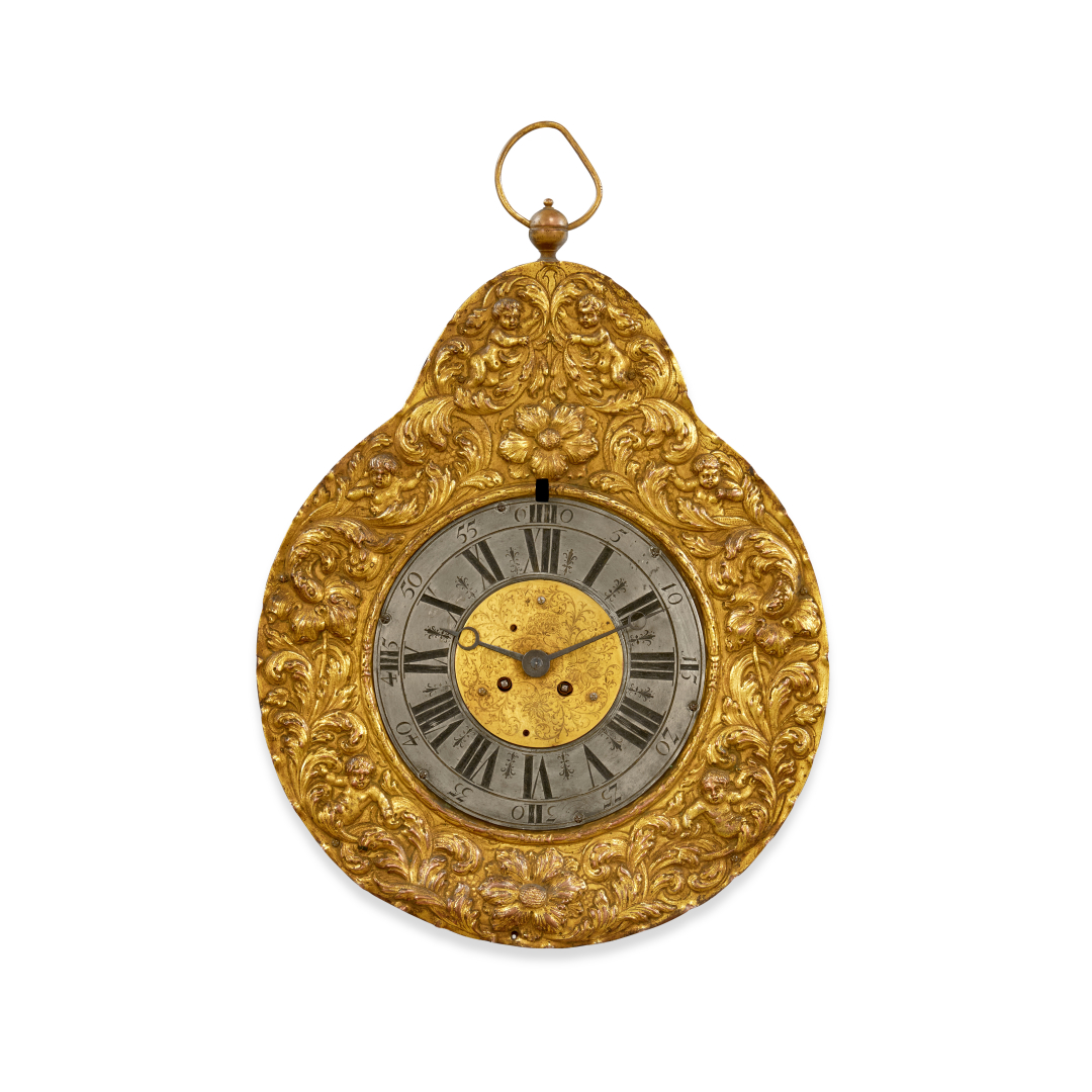 Embossed gilt-brass decoration with scrolls and puttos. Silvered chapter ring dial, front pendulum missing, verge escapement movement, striking the hours and quarters on bells.