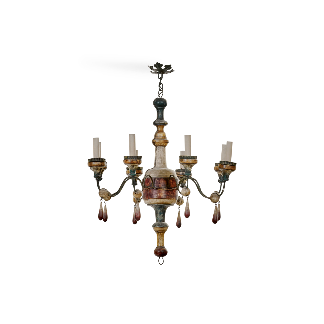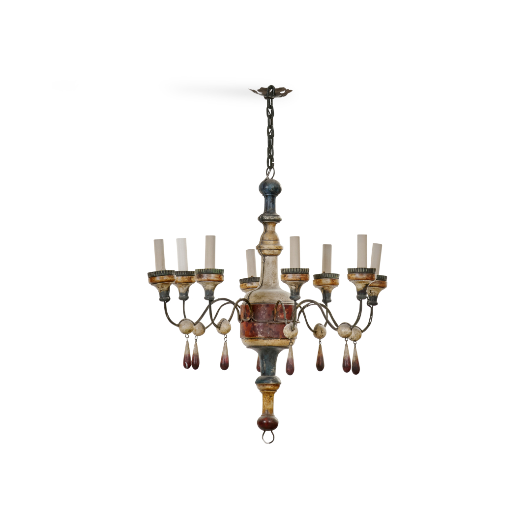 Painted in polichromy wood and tolla, with with lacquered wooden drops, with eight lights.