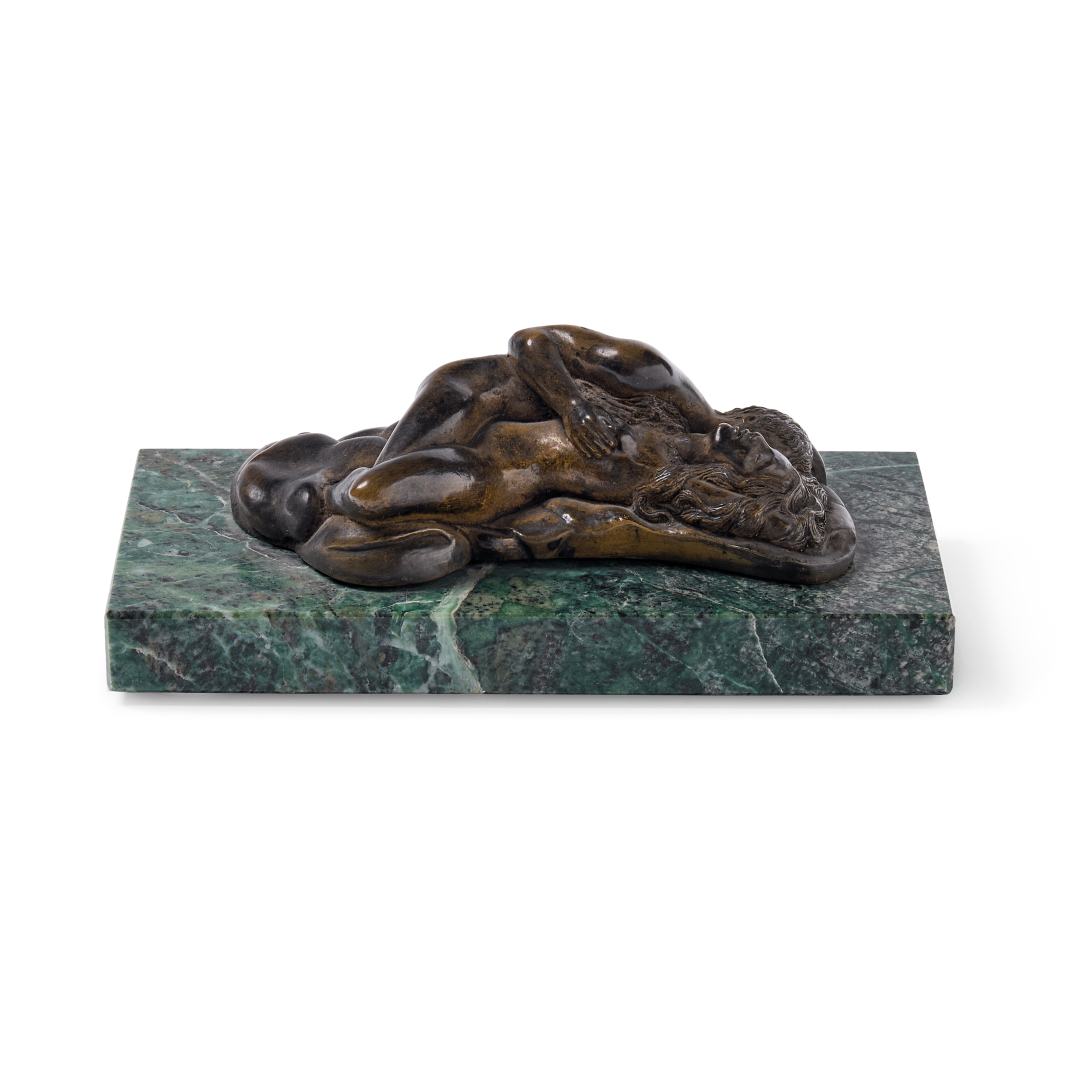 Bronze, inscribed B under the pillow at the figures' feet, on green marble rectangular base.