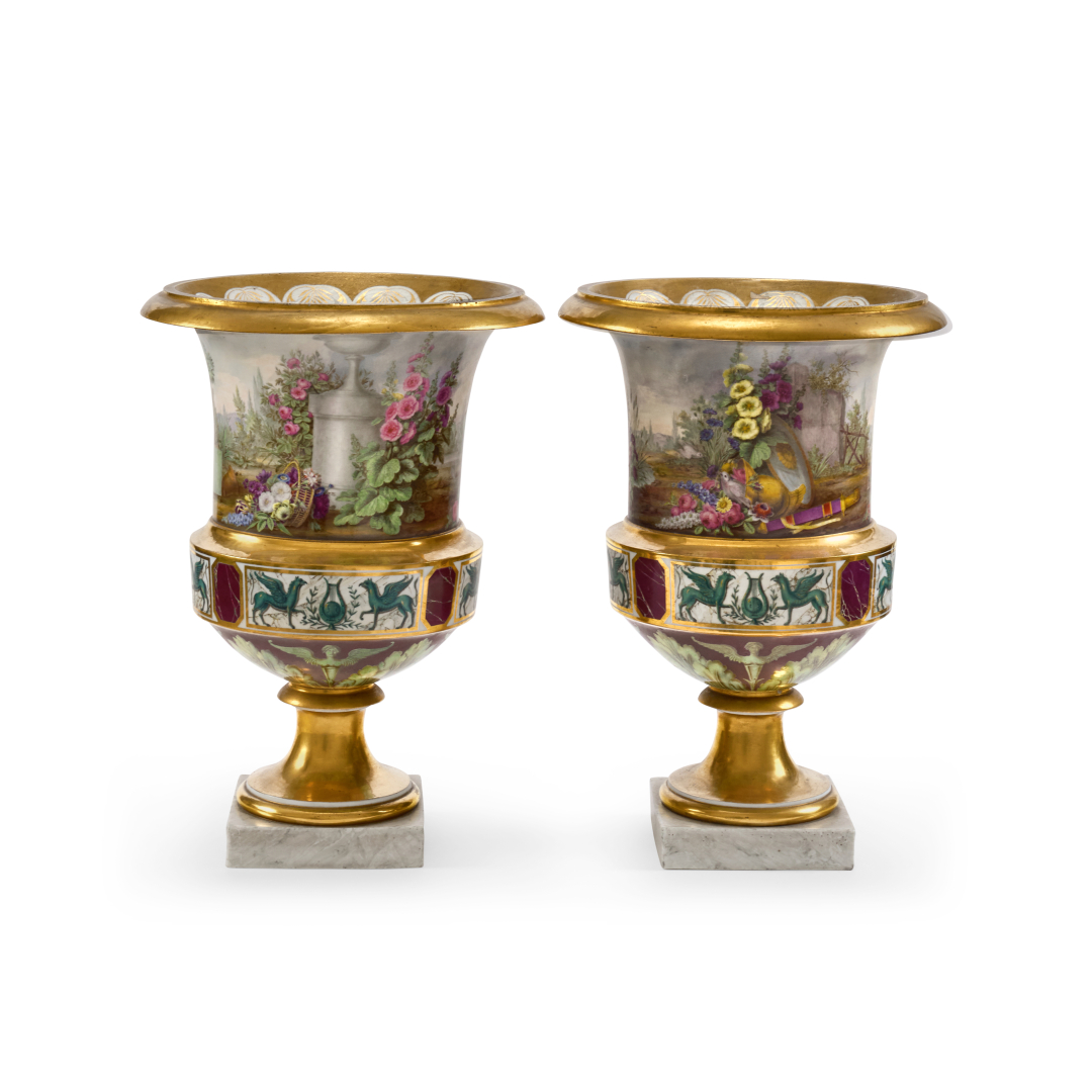 Porcelain, painted in polychromy with garden, coat of arms ad musical motifs decoration, on square marbled bases.