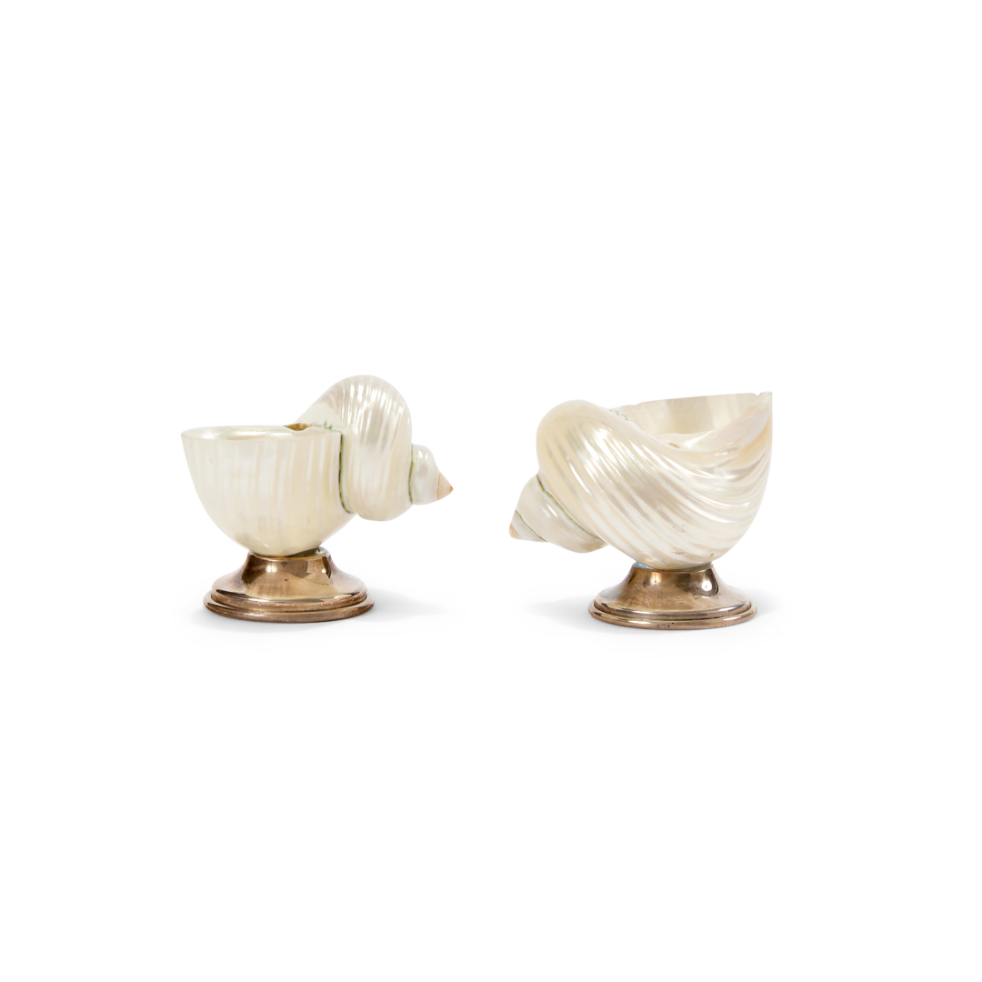 Circular silver bases surmonted by two mother-of-pearl shells.