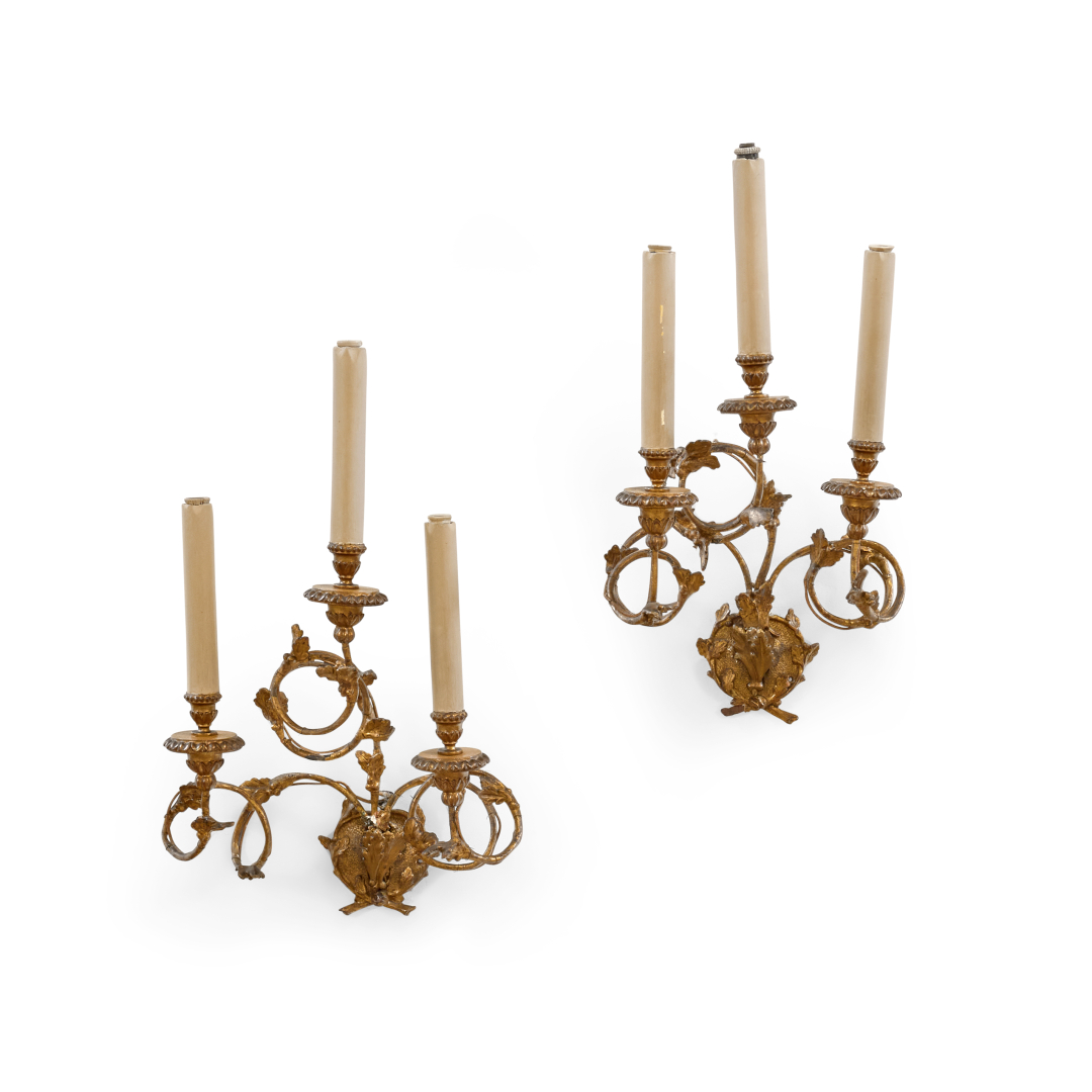 Carved gilt-wood, gilt-metal, spiral-shaped arms and leaf decorations, with three lights.