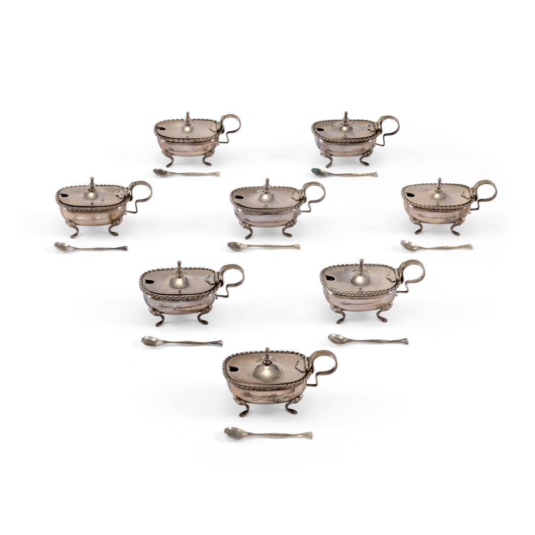 Rectangular with rounded corners, with feral legs, liners and en suite spoons, within cardboard box lined with silk.