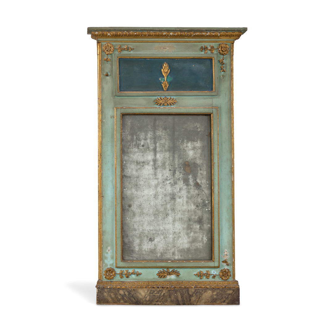 Lacquered, painted and partially gilt-wood, with gilt-wood phytomorphic applications, painted faux-marbre base, coeval mirror.