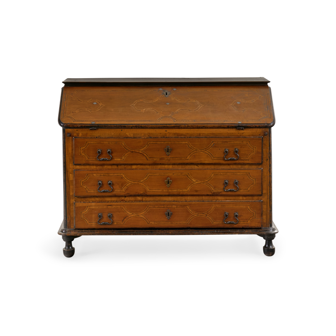 Walnut with geometric and star-shaped inlay patterns on the sides, ebonised wood profiles and feet, three drawers, fallfront with internal drawers, doors and compartments.