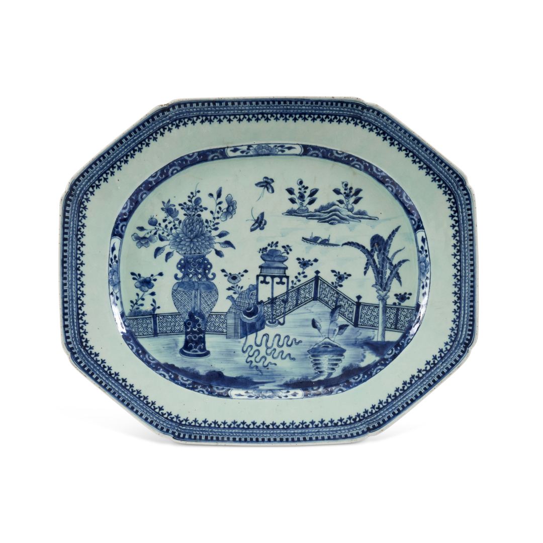 Porcelain, under enamel decoration depicting scenes of a fence with a vase of flowers and plant motifs.