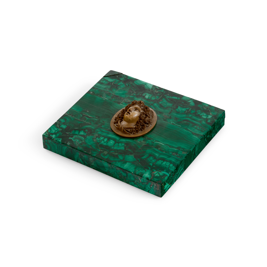 Lava stone carving, mounted on a stone and malachite base, label of the “Galleria Alberto Di Castro, Rome” on the reverse.
