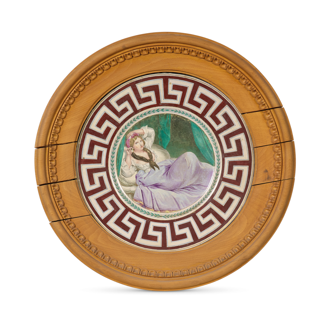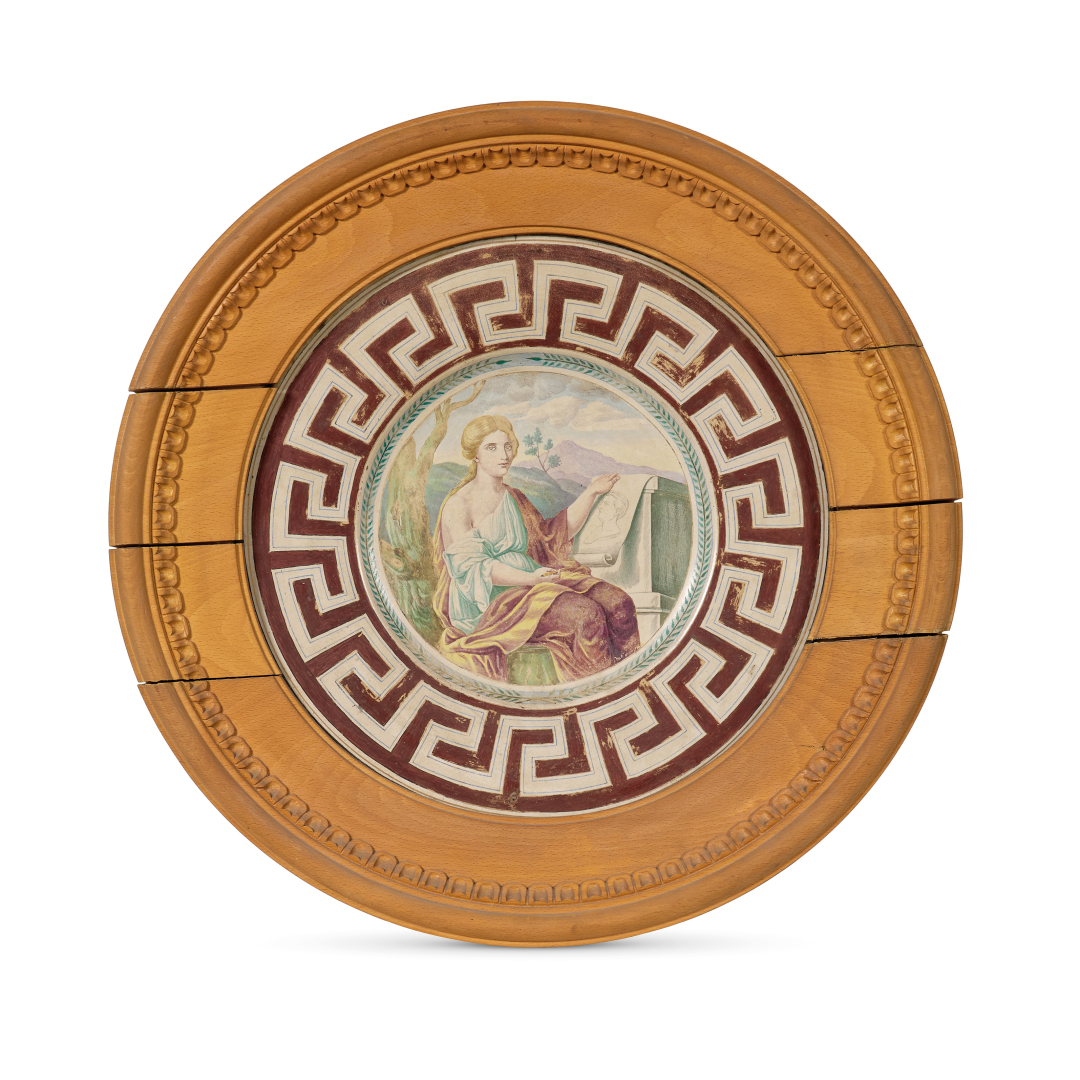 Polychrome ceramics, one depicting a woman in allegorical garments, the other  a woman lying holding a clock, both surrounded by a frieze and within circular wooden frames.
