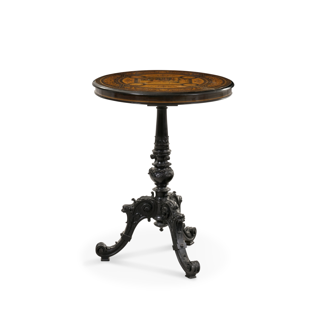 Ebonised wood, circular top with inlay and fillet decoration in various woods.