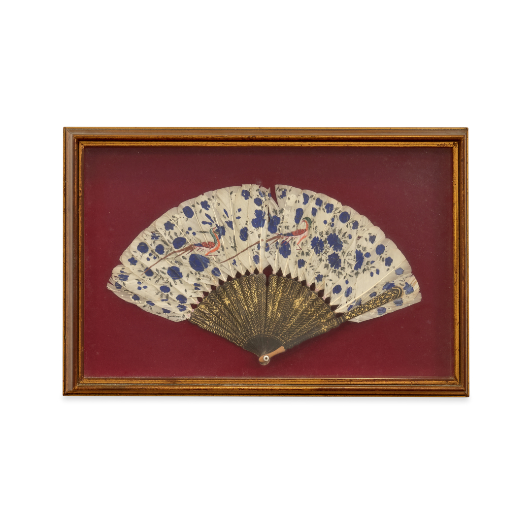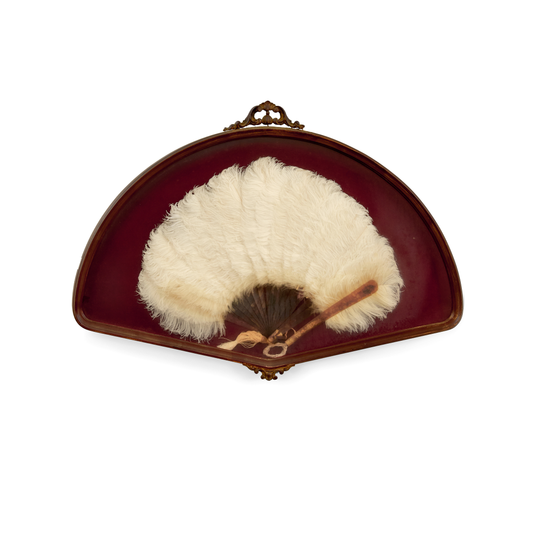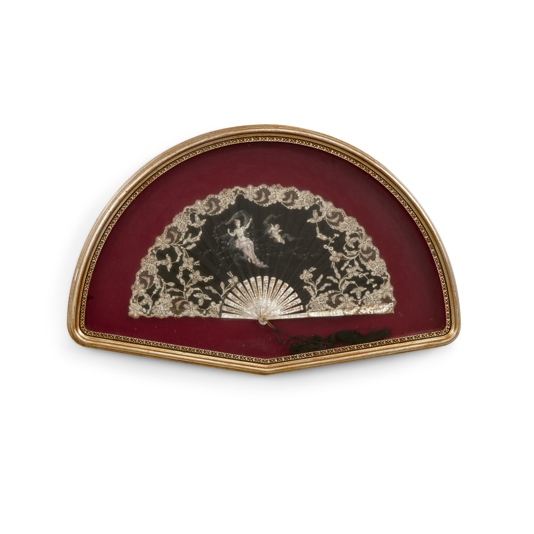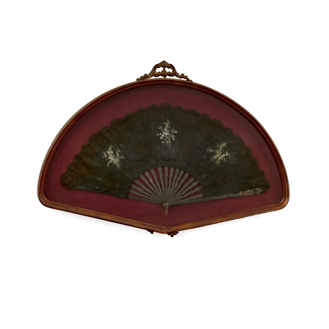 One in painted feathers decorated with birds, one in ostrich feathers, one in black lace with painted bouquets of flowers and one with lace decoration, a painted allegorical scene and engraved mother-of-pearl slats. All framed.
