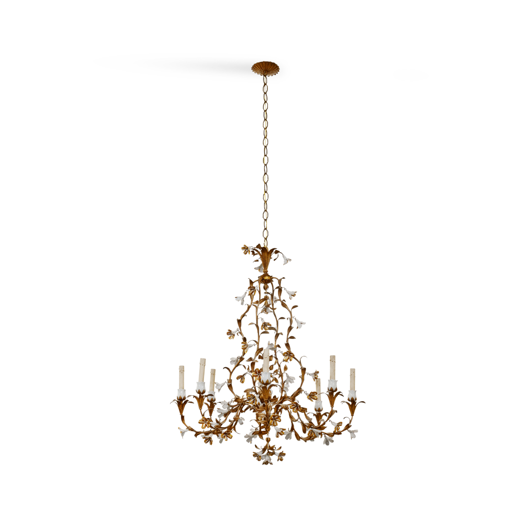 Painted and gilt-metal tolla, with eight lights, the arms decorated with leaf scrolls and flowers.