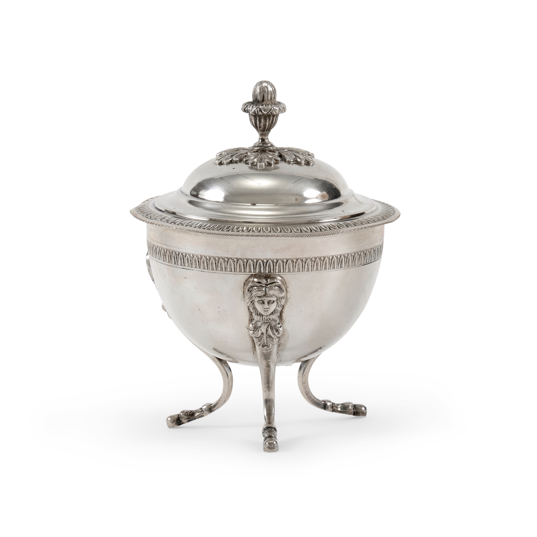 Circular with water leaf edges, tripod, legs with masks, lid topped with an acorn.