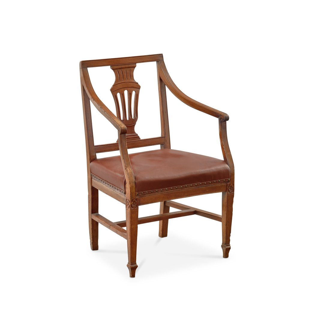 Carved wood, openwork backrest with lyre motif, leather upholstering.