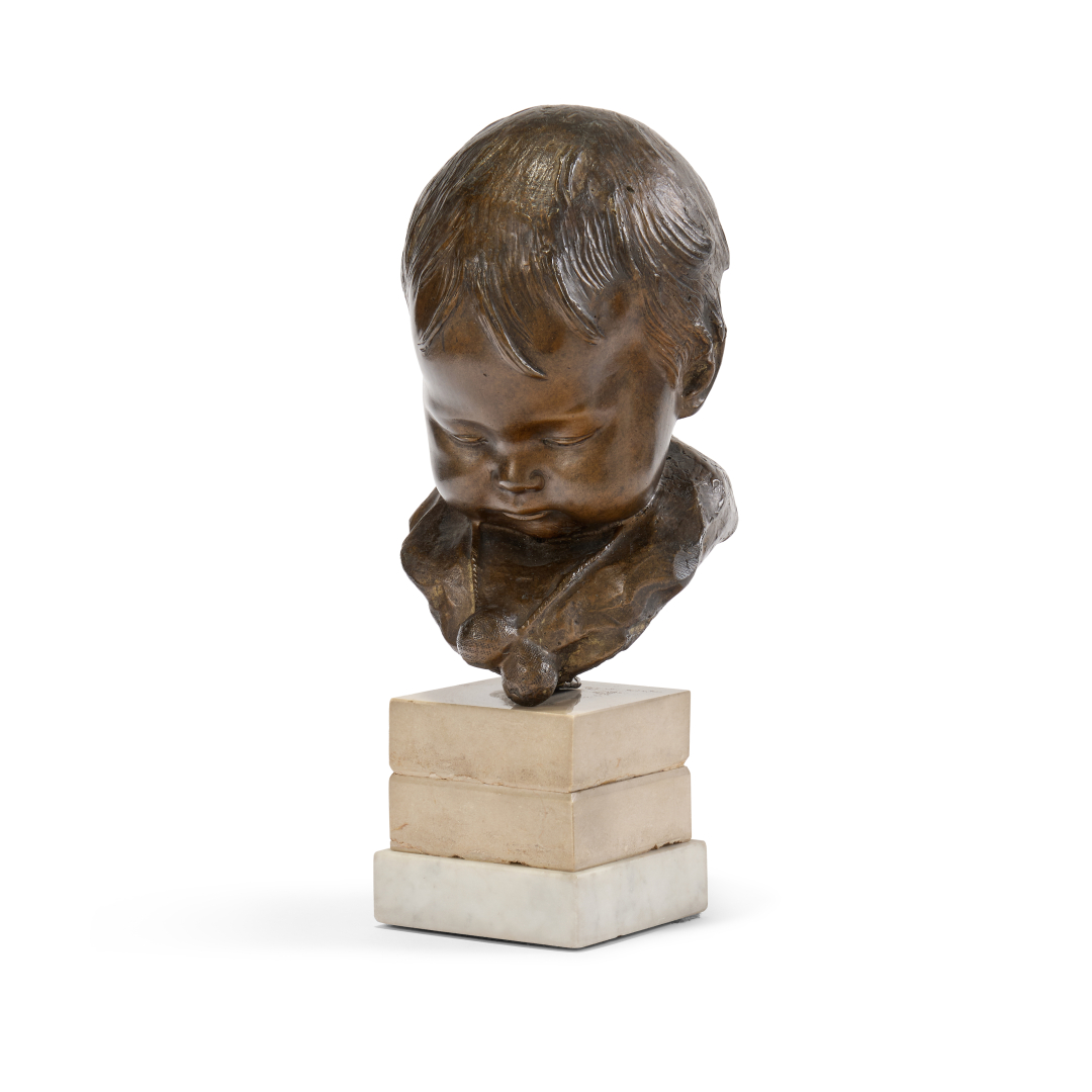 Dark patina bronze, on white marble base.