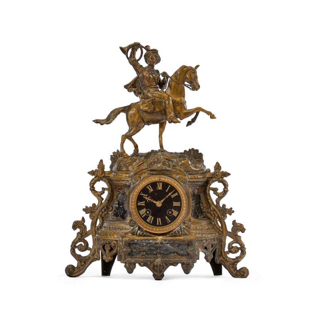 Brown patina antimony case, richly decorated and surmounted with the equestrian figure of a trumpeter.