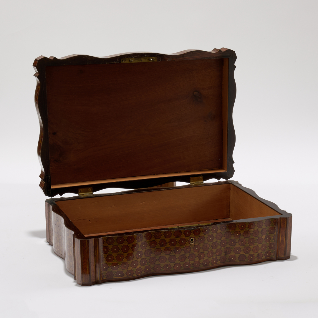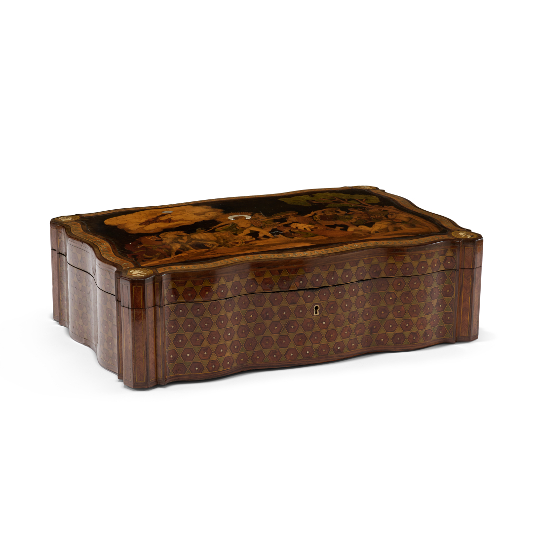 Wood, briarwood, precious woods and bone, finely inlaid with parquetry motifs, depicting a mythological scene on the lid.