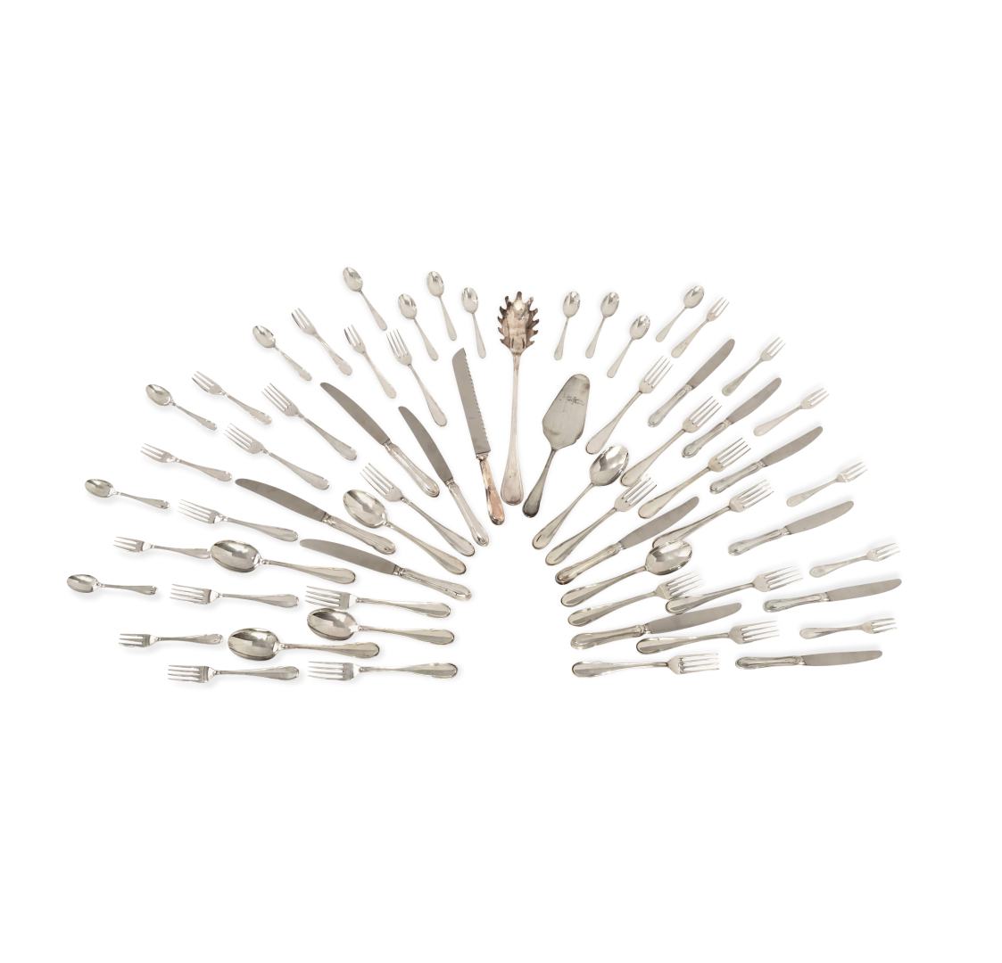 Including twelve forks, six knives and six large spoons, six fruit forks and knives, twelve dessert forks and twelve teaspoons, and a cake server.