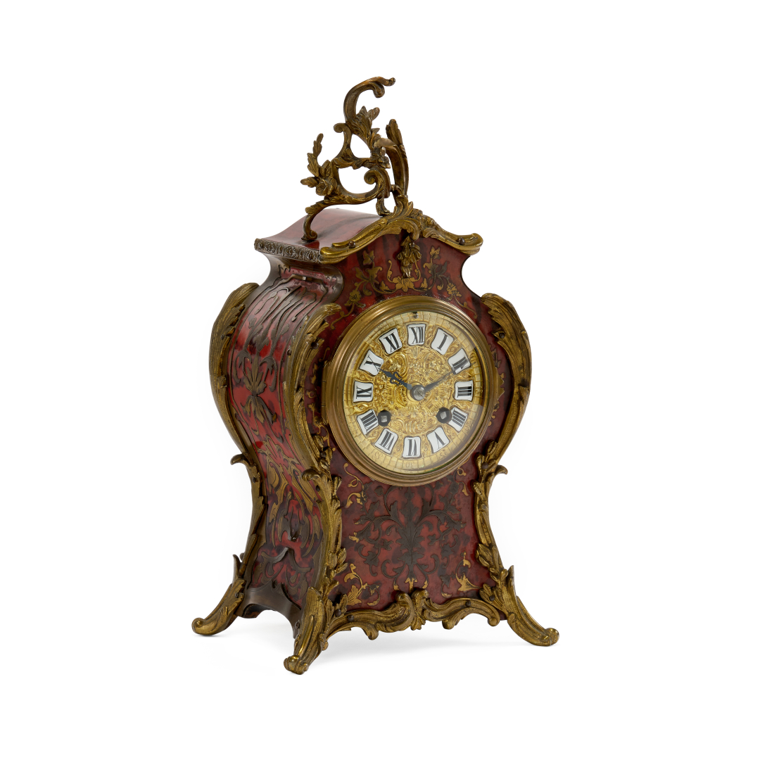 Chased and gilt-metal dial with white enamel cartouche numerals, anchor escapement movement with spring suspension, striking the hours and half-hours on a gong.
