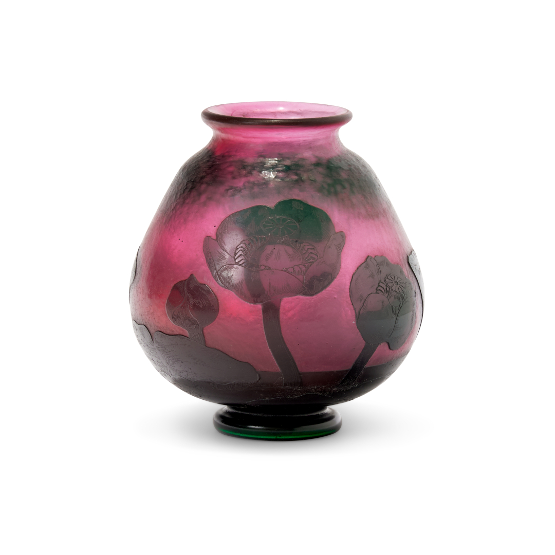 Double purple glass with acid-etched poppy flower decoration, “Daum Nancy” signature engraved on the base.