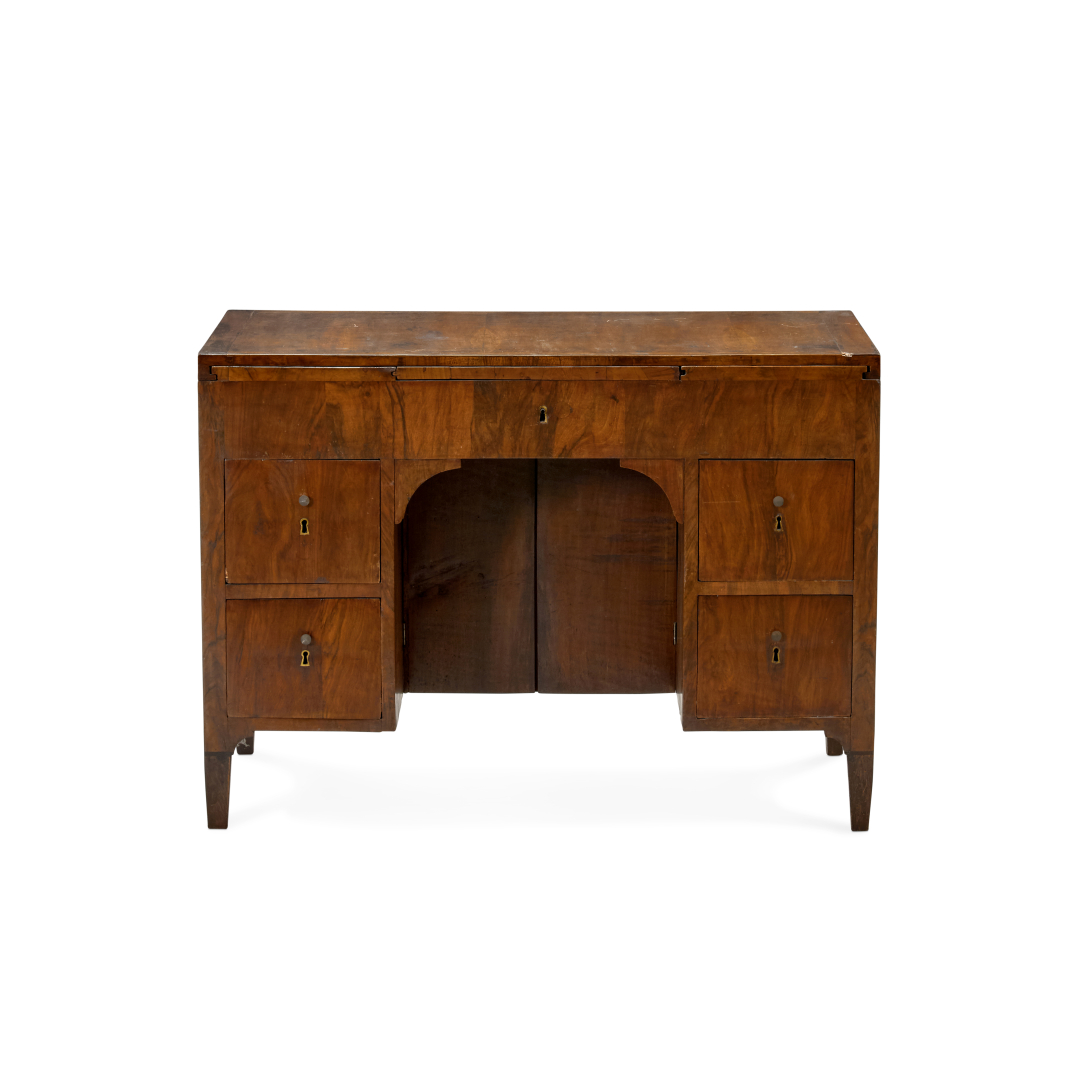 Walnut, a pull-out shelf under the top, with four drawers.