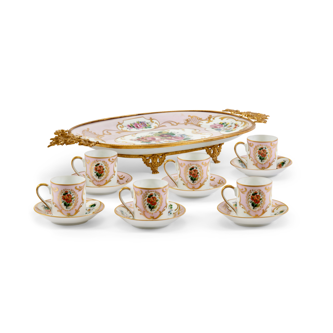 Porcelain, painted printed with decals and gilted, the tray mounted in gilt-bronze. Lot comprising six coffe pots, six saucers and a tray.