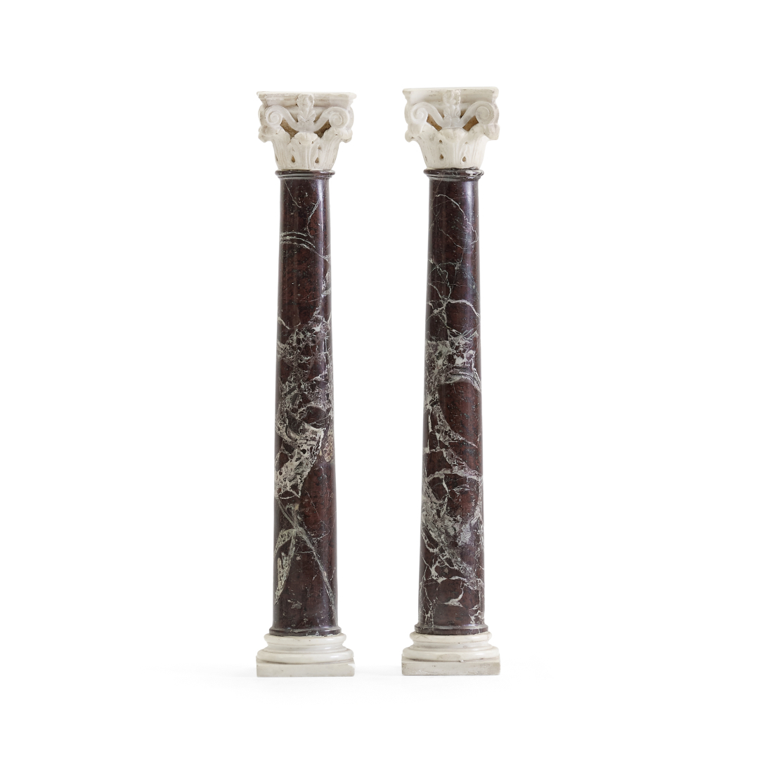 Red veined marble smooth stem, Corinthian order capitals, on white marble bases.